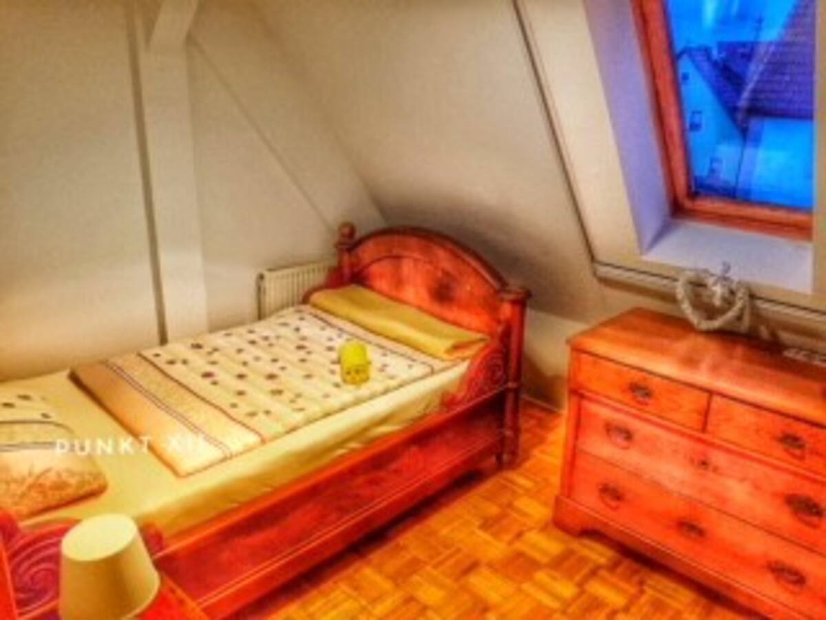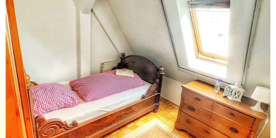 Das Zimmer hat ein Einzelbett, eine Kommode, einen Stuhl und Nachttischlampe. Es gibt die Möglichkeit Kleider aufzuhängen. Die Farbgestaltung ist hell und freundlich gehalten, die Möbel aus Holz. Das Badezimmer befindet sich auf dem Flur von Wohnung 2 und wird gemeinsam mit anderen Gästen dieser Wohnung je nach Belegung genutzt.